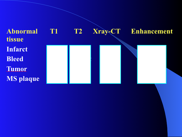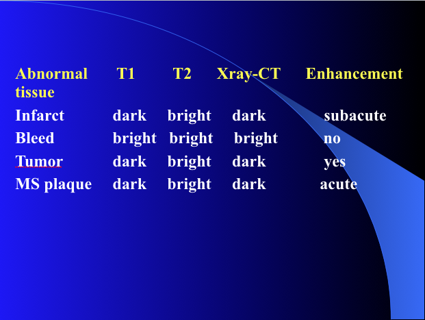 infarcts, tumors and MS plaque are dark in which?