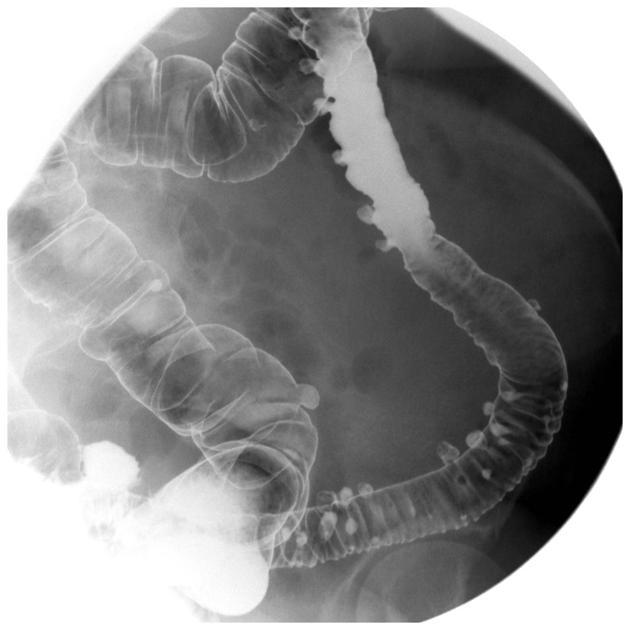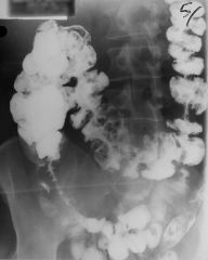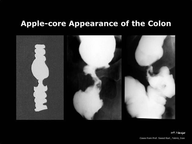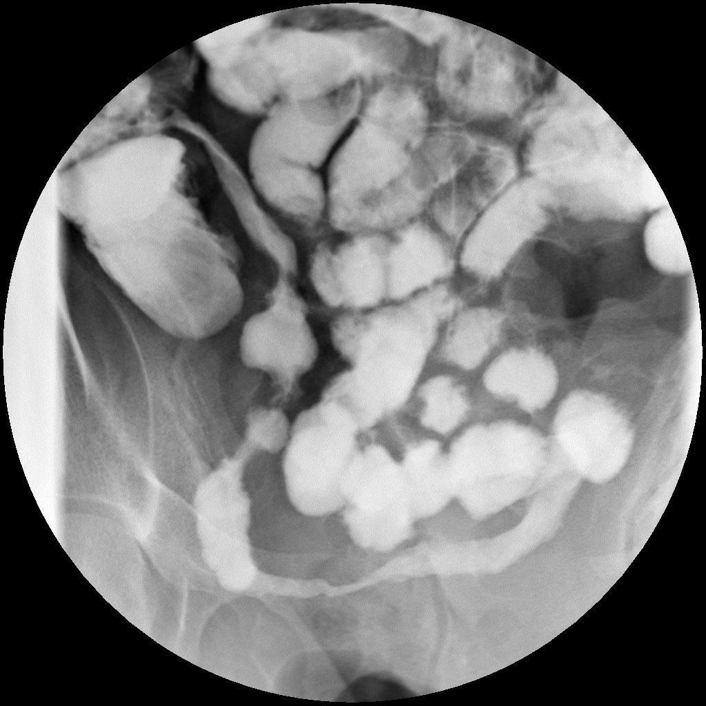 small bowel is central and have valvulae conniventes - lines crossing full width of bowel