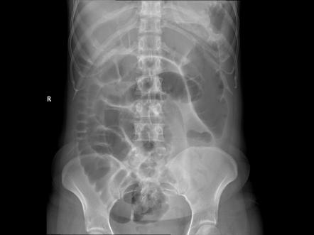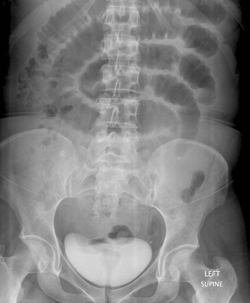 Large bowel is more peripheral, mottled appearance due to faeces and gas content, haustra that do not cross whole width