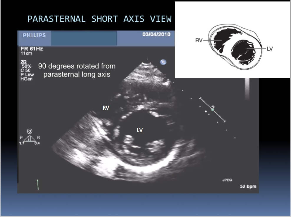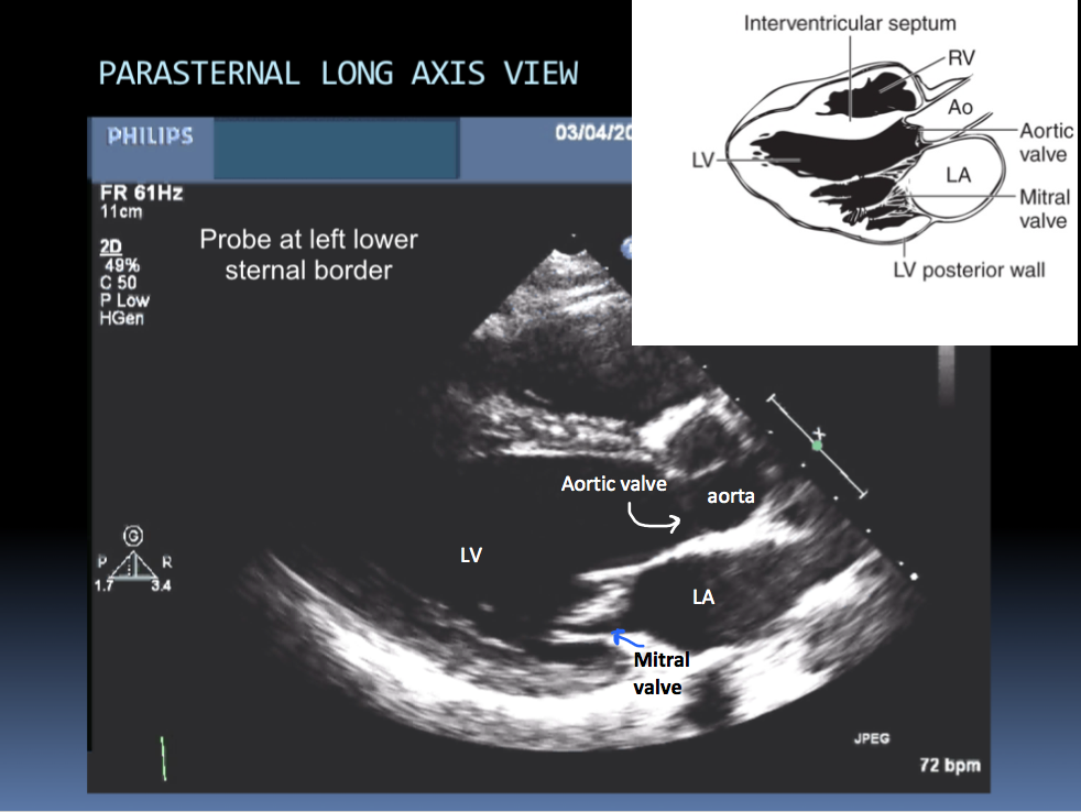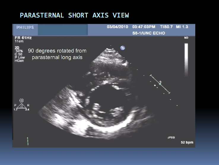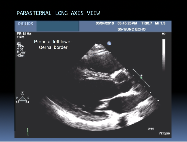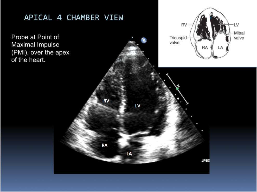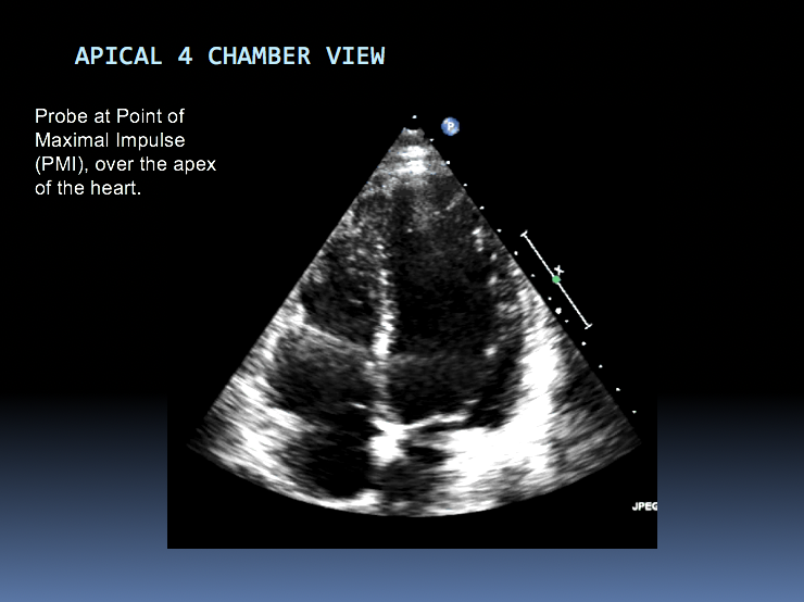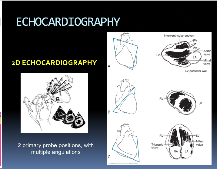 Have 2 primary probe positions, with multiple angulations (multiple ultrasonic beams are transmitted from transducer through a wide arc). The returning signals are integrated to produce 2D images of the heart on a video monitor.