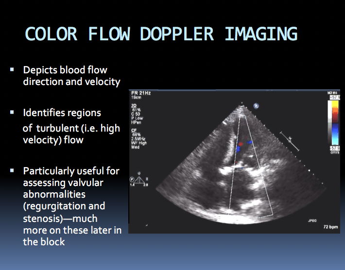 Particularly useful for assessing valvular abnormalities (regurgitation and stenosis)