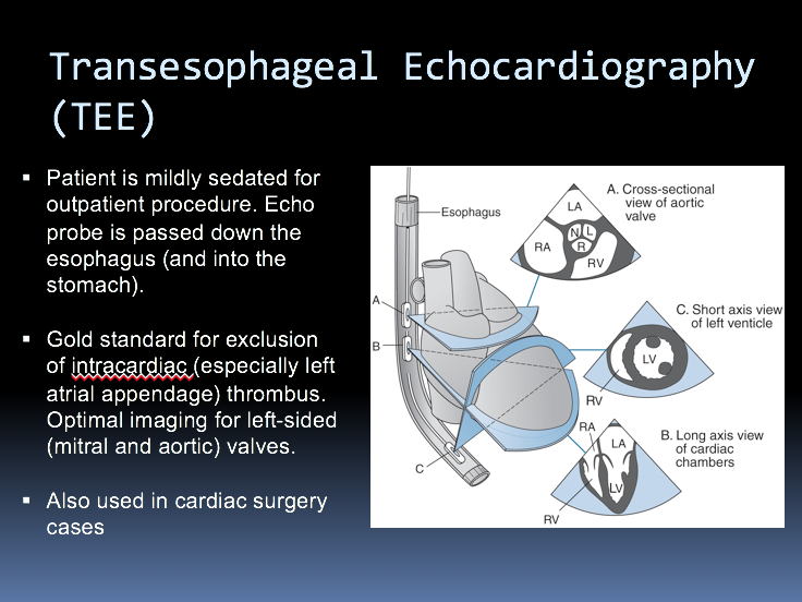Patient is mildly sedated for outpatient procedure. Echo probe is passed down the esophagus (and into the stomach).