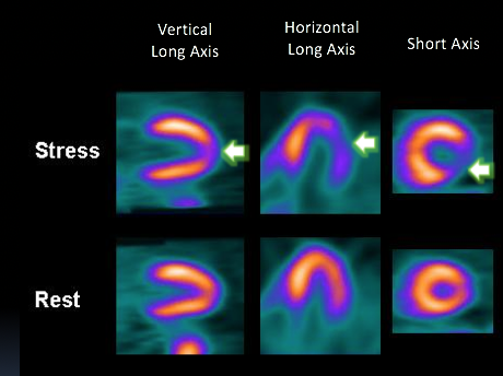 Note the uniform uptake of tracer at rest, with areas of poor uptake after stress.