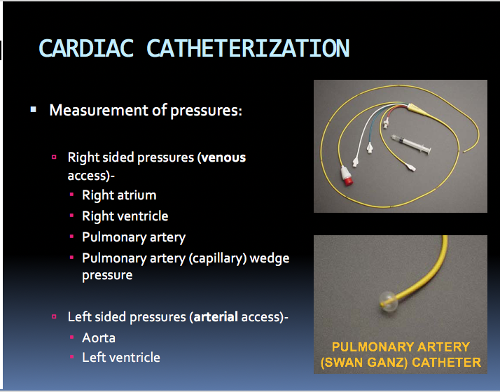 Right Heart Catheterization (RHC or Swan Ganz): performed via the venous route to measure pressures on the right side of the heart and out into the pulmonary artery (lungs)