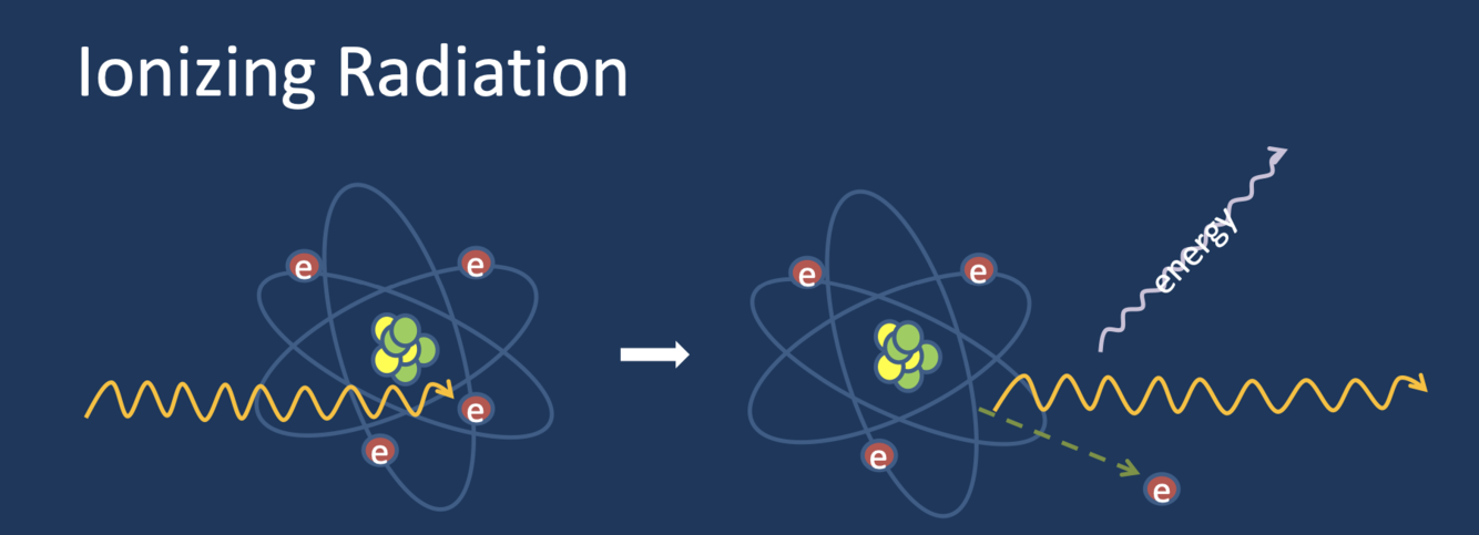 Ionizing radiation is radiation with enough energy so that during an interaction with an atom, it can remove tightly bound electrons from the orbit of an atom, causing the atom to become charged or “ionized”