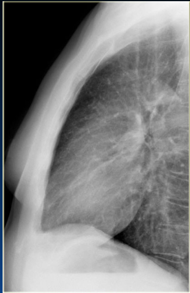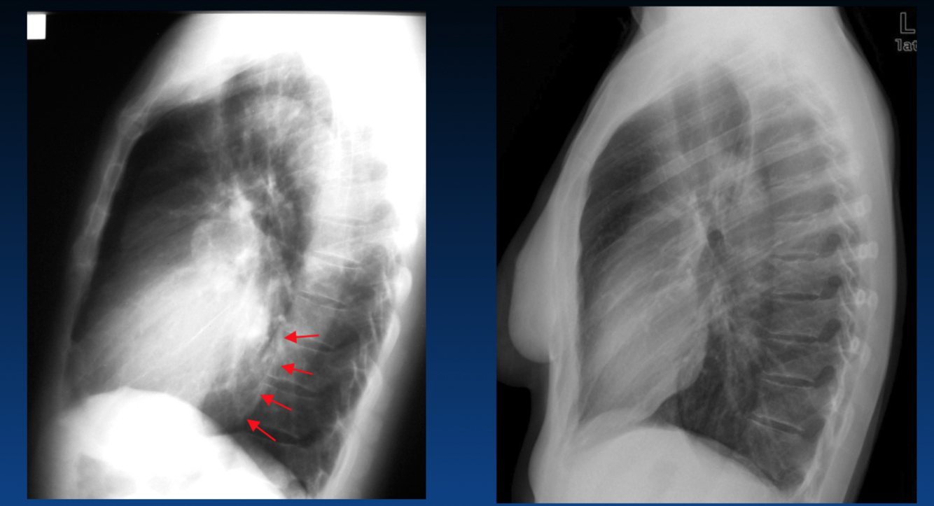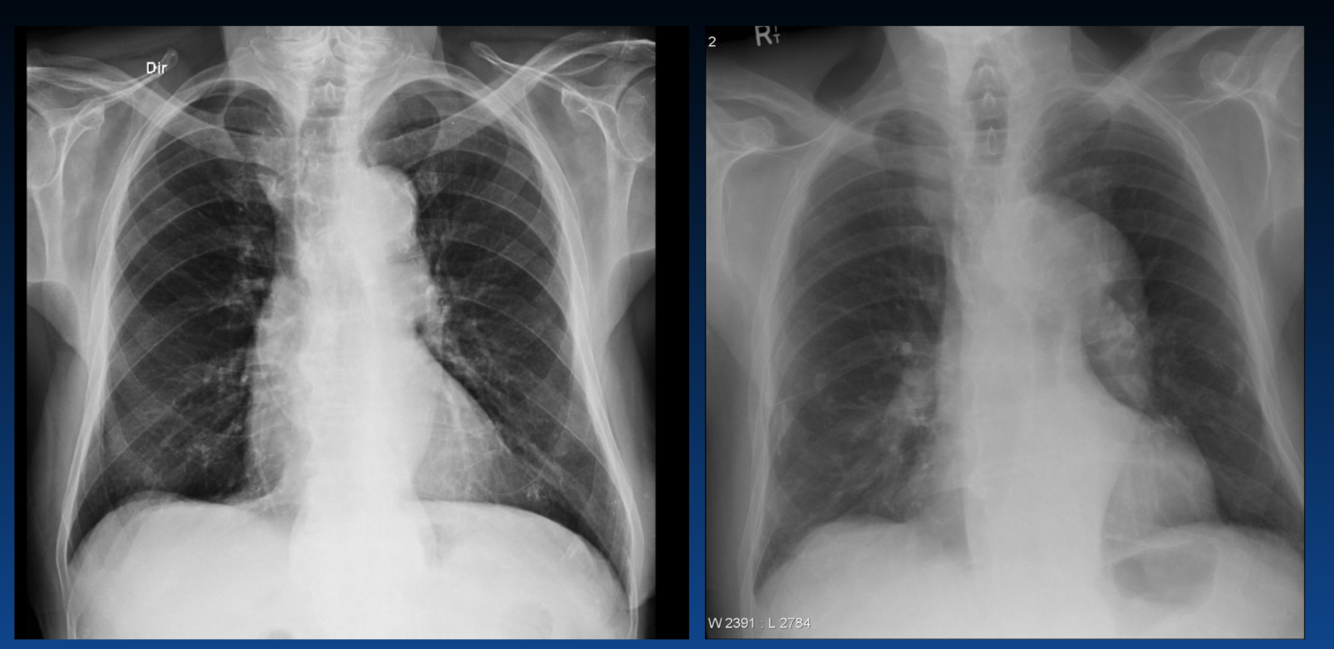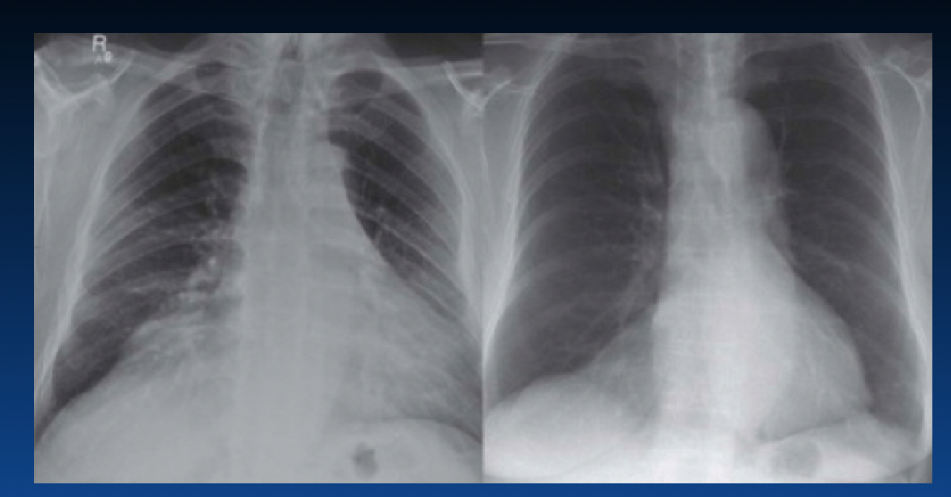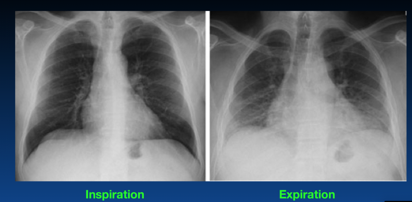 You can tell an expiration by the height of diaphragm as well as counting the ribs (the right only shows 4 ribs). You should see 6 or 7 ribs.