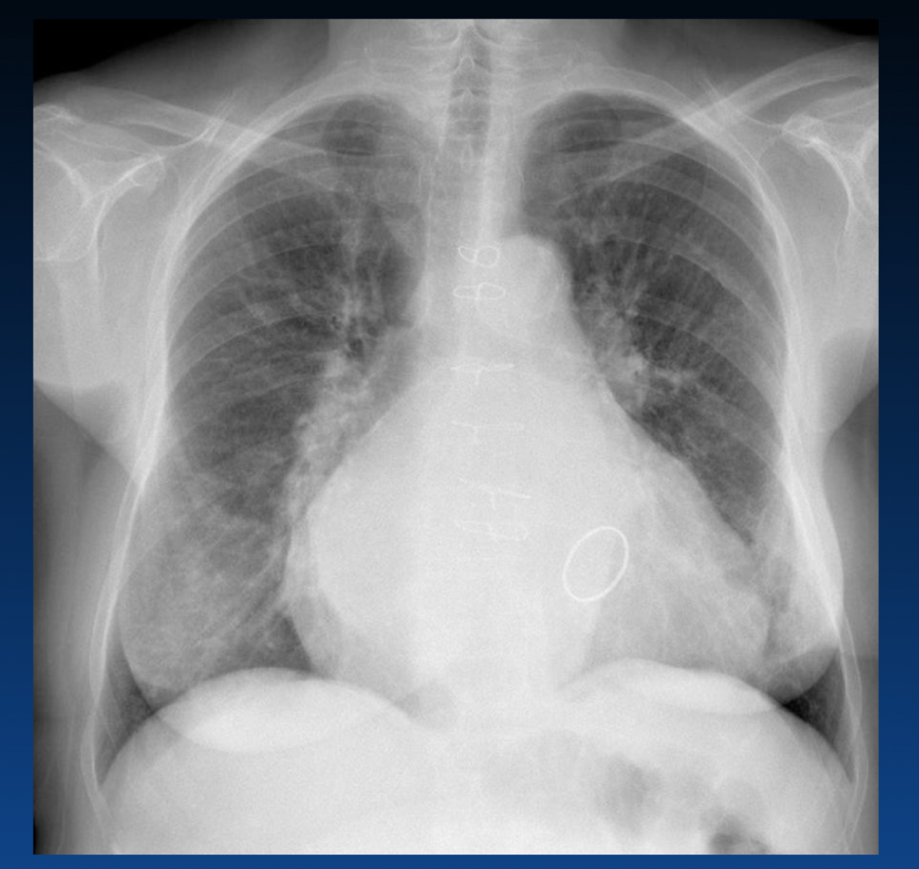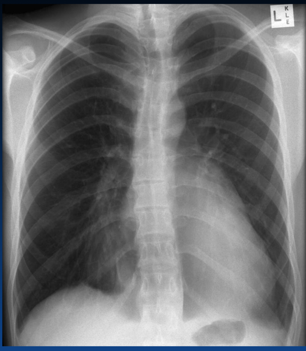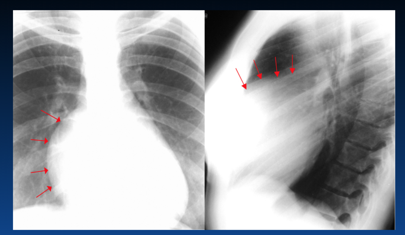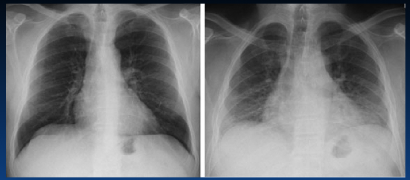 You can tell an expiration by the height of diaphragm as well as counting the ribs (the right only shows 4 ribs). You should see 6 or 7 ribs.