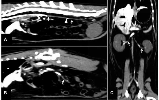 Multiple filling defects of the arterial system, including abdominal aorta, bilateral large infarcts to the kidneys as no contrast is present within them and cranial mesenteric artery.