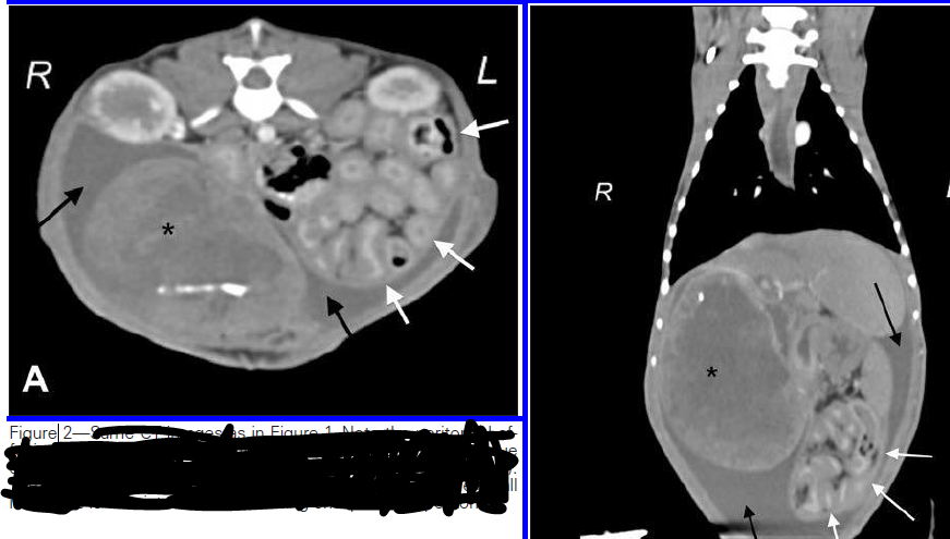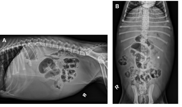 Adult feline presented for abdominal pain and dragging rear limbs.