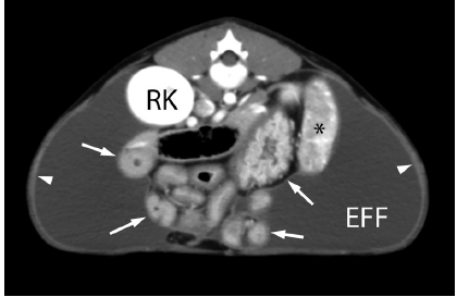 Large volume of loculated fluid were noted in ventral abdomen that appeared separte from the abdominal contents (no flaoting or suspension of abdominal organs), Peritoneal lining was thickened.