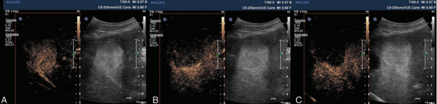 Portal and venous phase: hypoechoic to surrounding hepatic parenchyma.