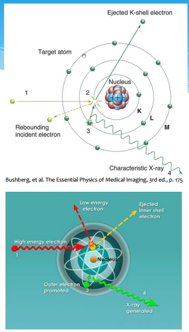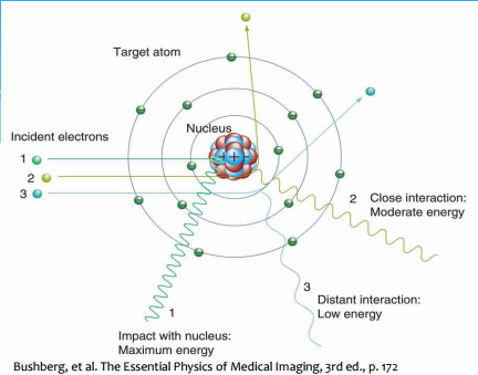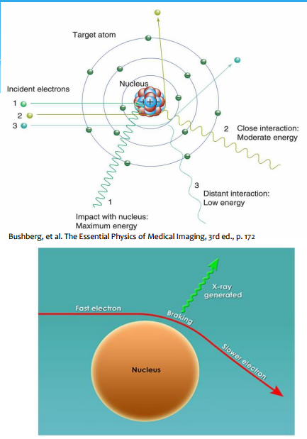 When an electron passes near the nucleus it is slowed (braking) and its path is deflected. Energy lost is emitted as a (bremsstrahlung)