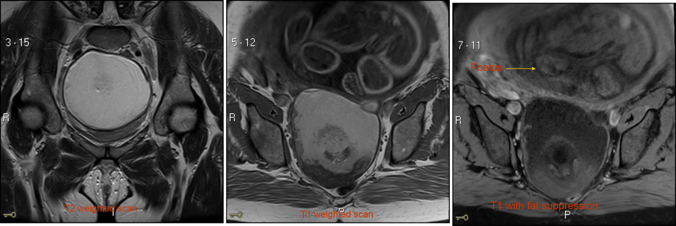 MR (especially T2-weighted sequences) is far better than CT at depicting local disease, but CT is often used to determine whether or not there are distant metastases – e.g. lung, para-aortic and mediastinal lymphadenopathy