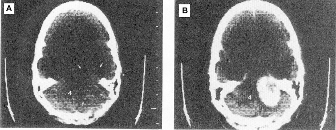 Acoustic neuroma is shown in CT scan by enhancer dye injected