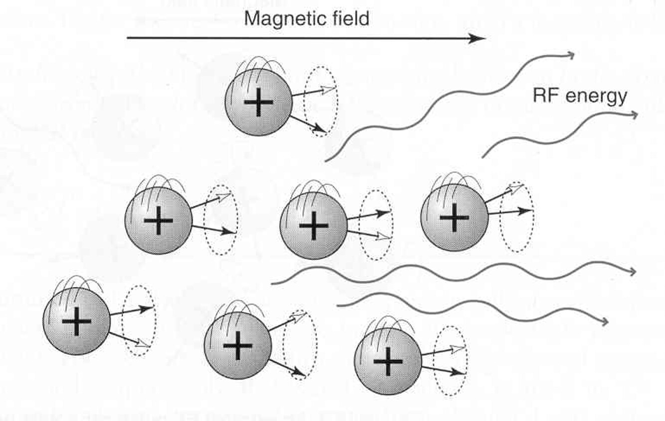 High energy status returning to a low energy one accomplished with an emission of RF energy (at Larmor frequency)