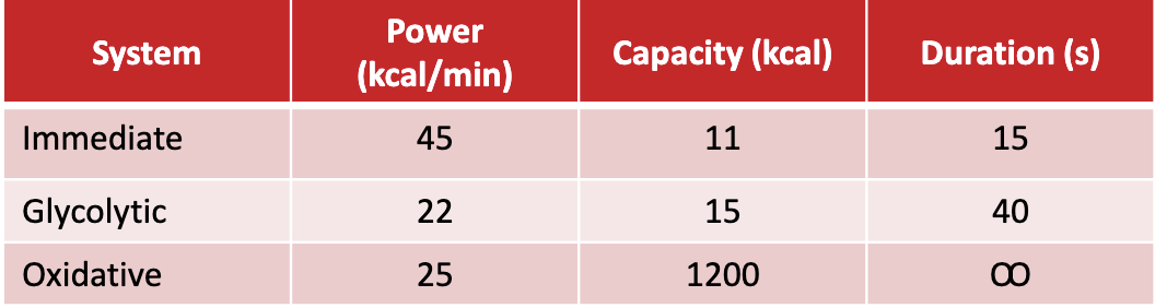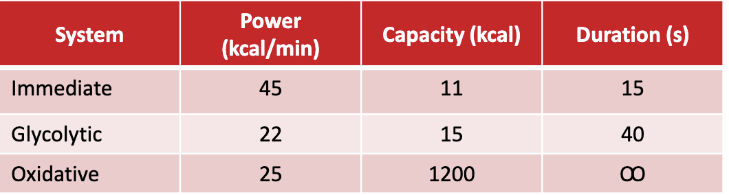 * A combination of stored ATP and PCr can sustain the muscles’ energy for ~ 3 to 15 s. Beyond that time, other energy systems should be activated.