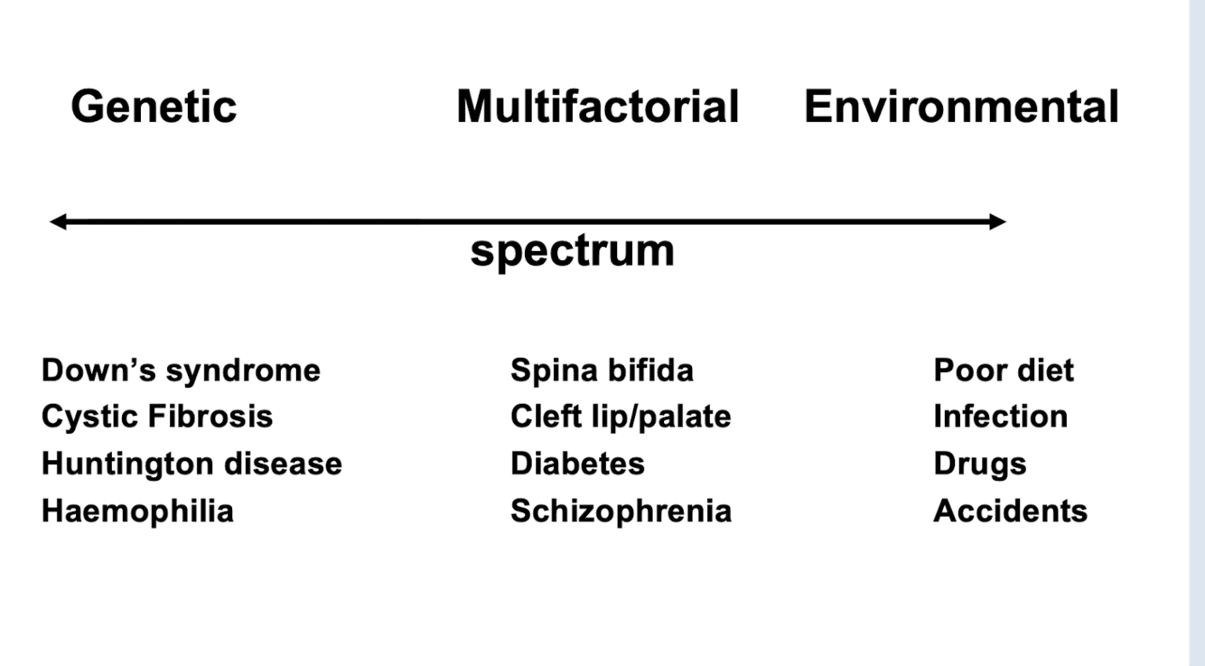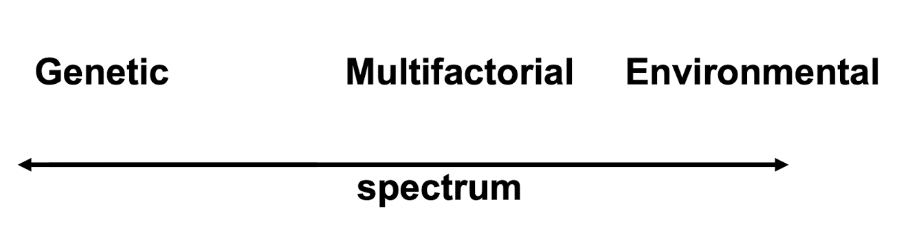 What are some examples of diseases caused by genetics, multifactorial and environmental?