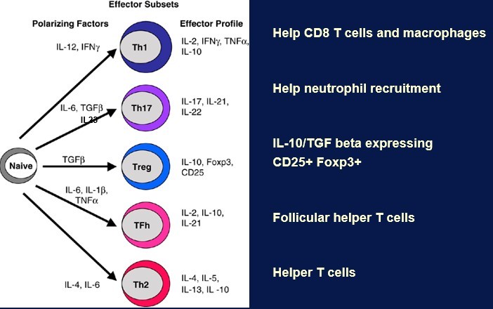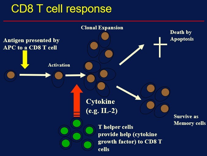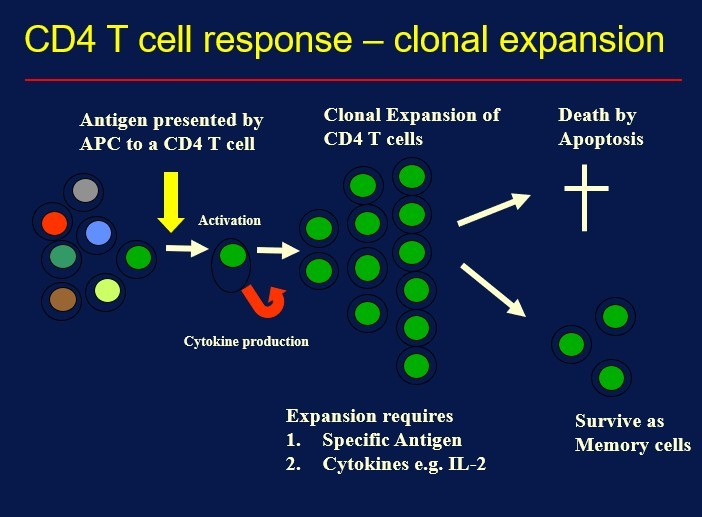 T cells with appropriate specificity will proliferate and differentiate into effector cells (cytokine secreting, cytotoxic)