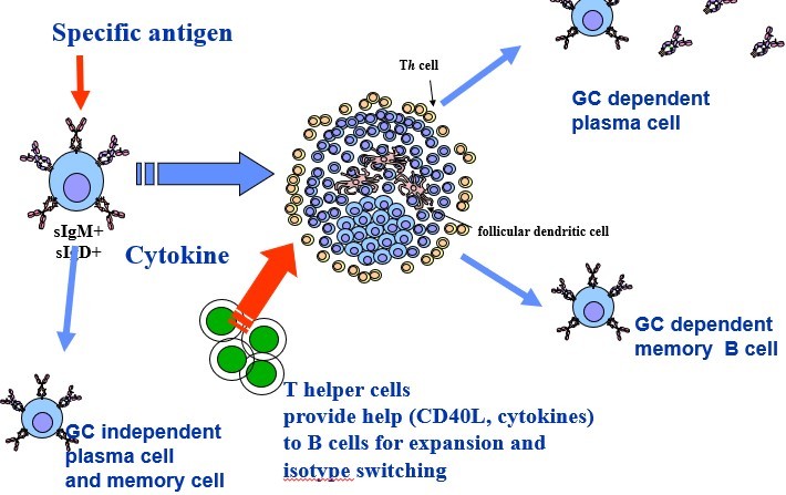 undergo germinal centre reaction and differentiate to T cell dependent IgG/A/E(M) memory and plasma cells