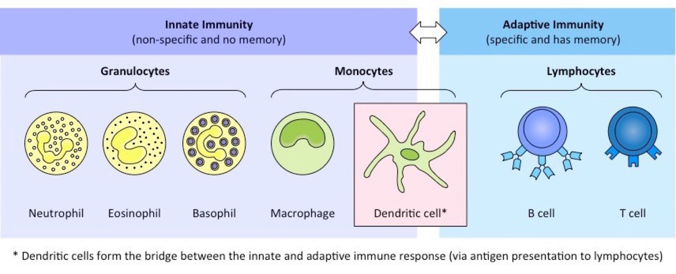 -leukocytes can be classified as monocytes (macrophages and dendritic cells), granulocytes (neutrophils, eosinophils, and basophils), or lymphocytes (T lymphocytes, B lymphocytes, or natural killer cells)