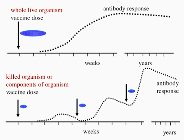 Killed organism/componenets of an organism: single shot (just the antigen with no ability to replicate), limited IS response, so to build up enough anitbodies and memory, you need to give 3-4 or more doses