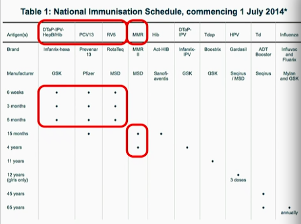 Some fractional vaccines are given at 6wks, 3mths and 5mths with booster, But attenuated live vaccines (MMR: measles, mumps, rubella) are given at the ages post 15mths.