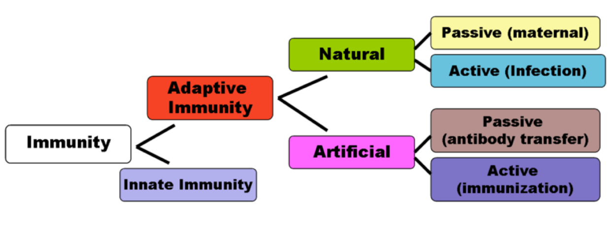 Adaptive – body produces antibodies in response to an infection, this is active