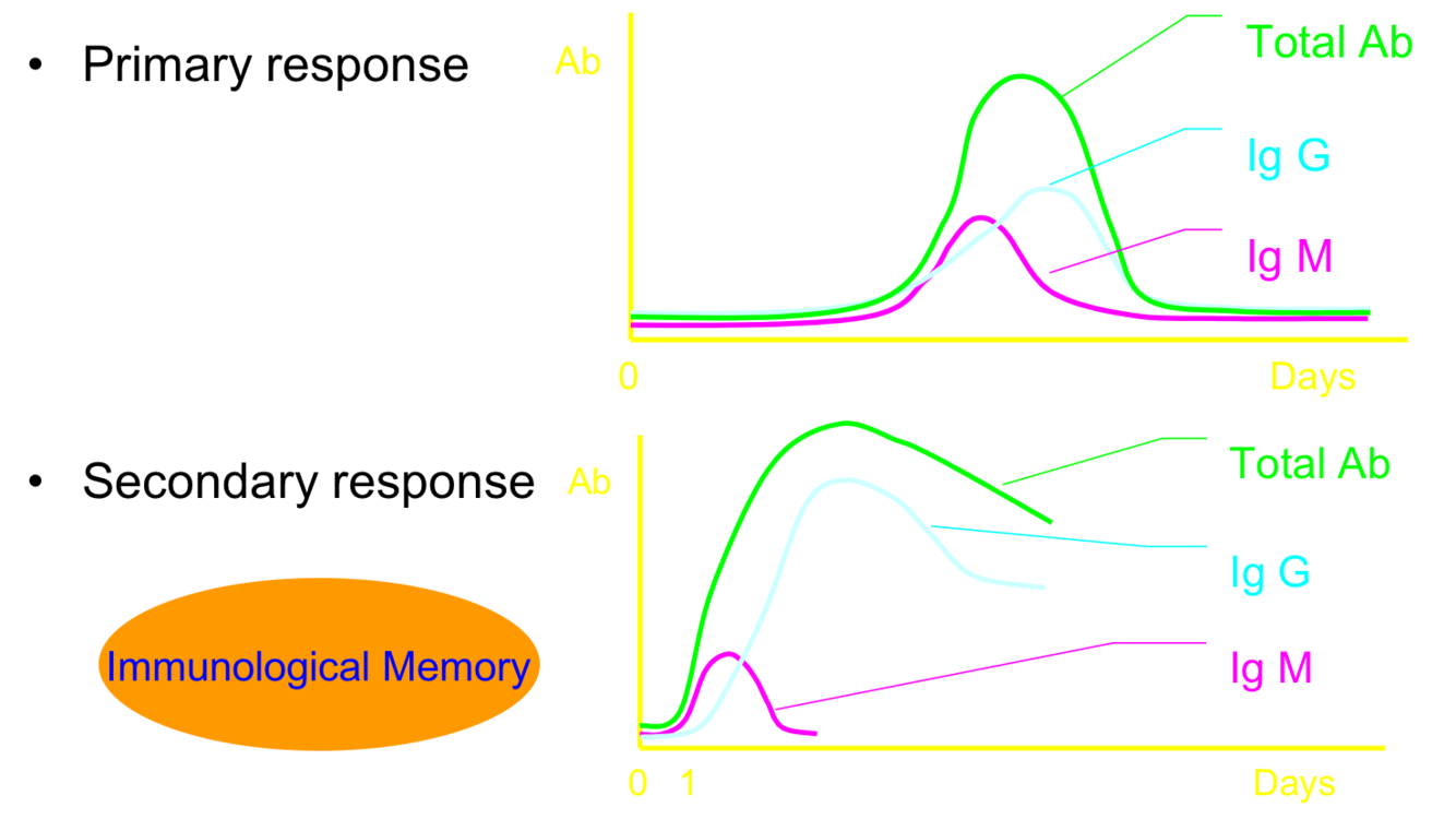 When exposed second time, total antibody response happens much quicker and at a higher level to prevent being infected again