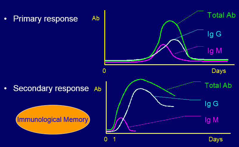 How does the antibody response to infection differ in the primary and secondary response?