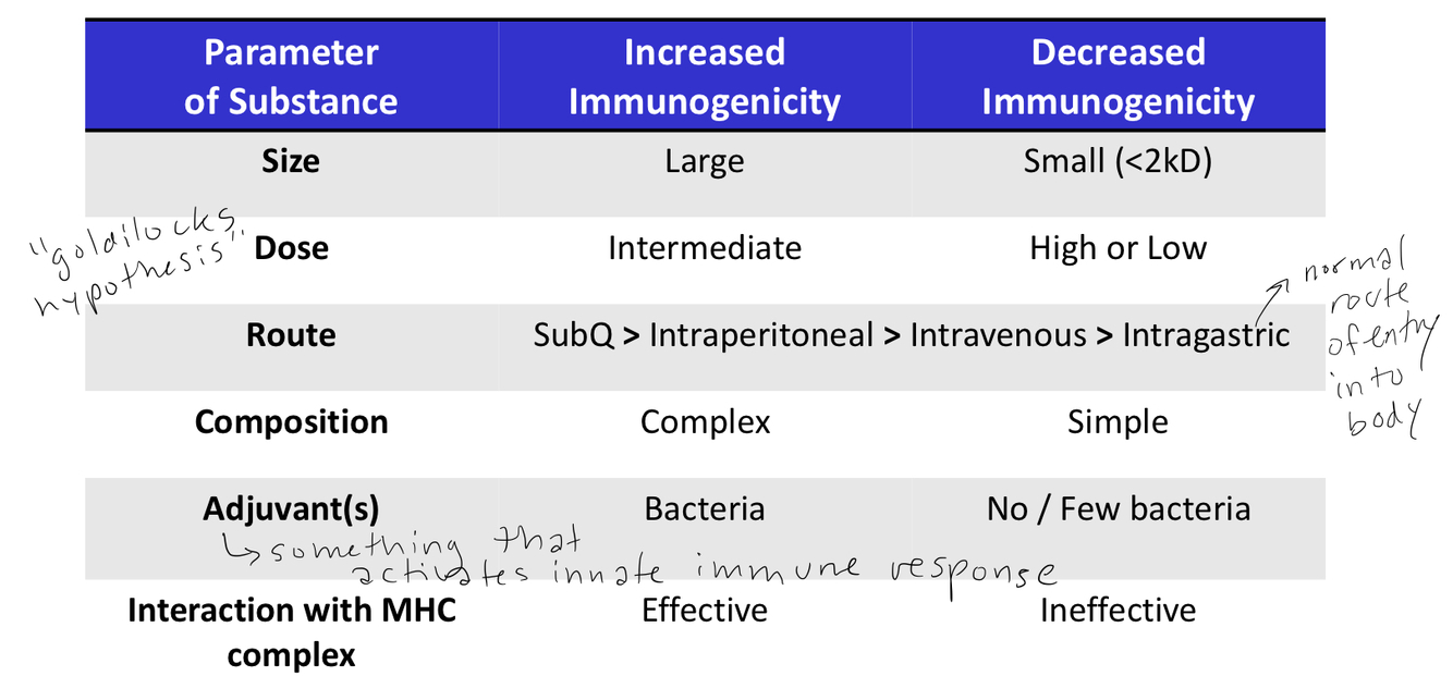 Large and complex, intermediate dose, administered SubQ, adjuvant (bacteria), and effective interaction with MHC complex