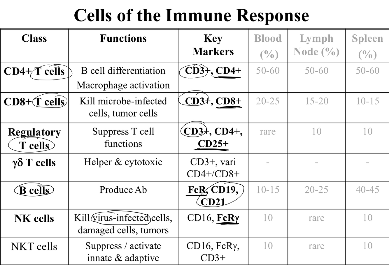 CD4+ for helper T cells, CD8+ for cytotoxic T cells, CD4+/CD25+ for regulatory T cells