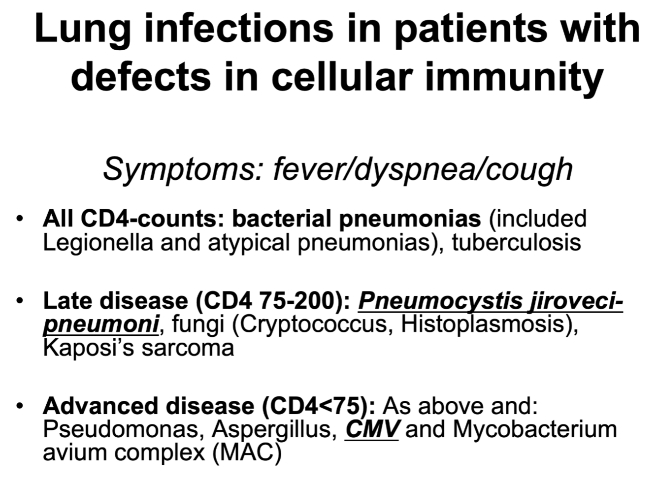 Hvilke lungeinfeksjoner oppstår hos pas. med svikt i cellulær immunitet?