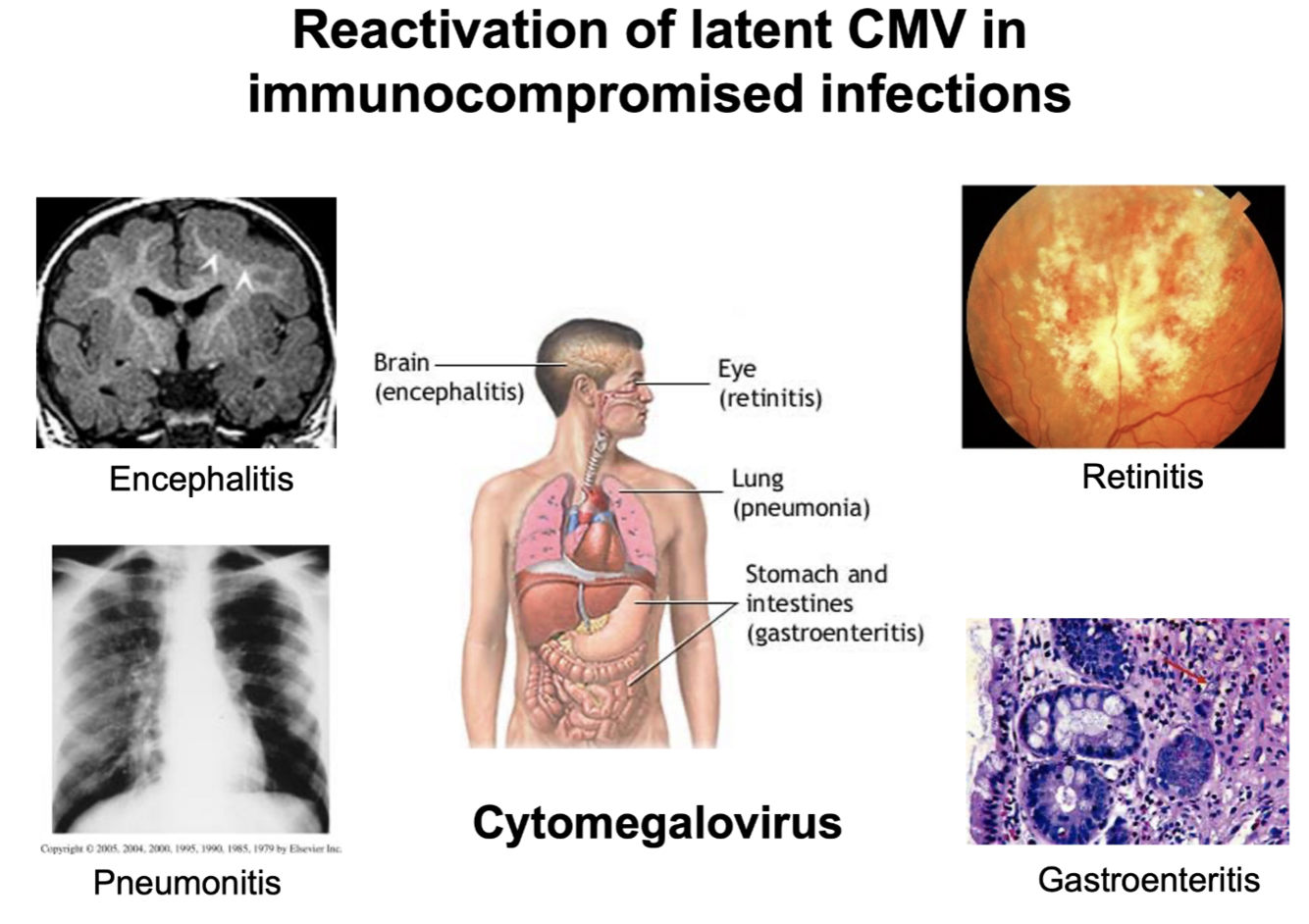 Hvilke lidelser kan reaktivering av CMV gi ved mangel på cellulær immunitet?
