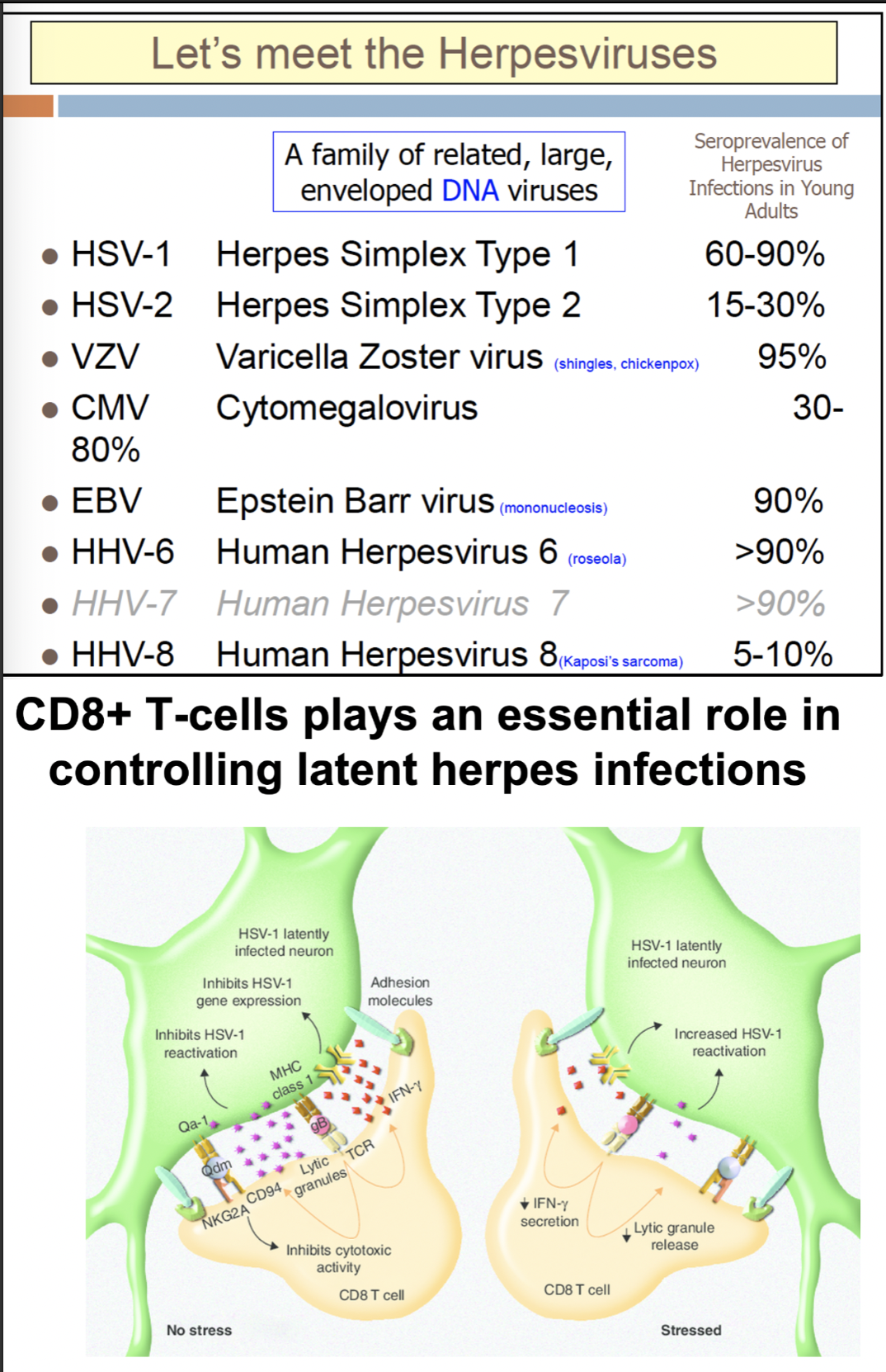 Hvilke virus tilhører herpesfamilien, og hvilken immunkomponent er viktig for å kontrollere latente herpesinfeksjoner?