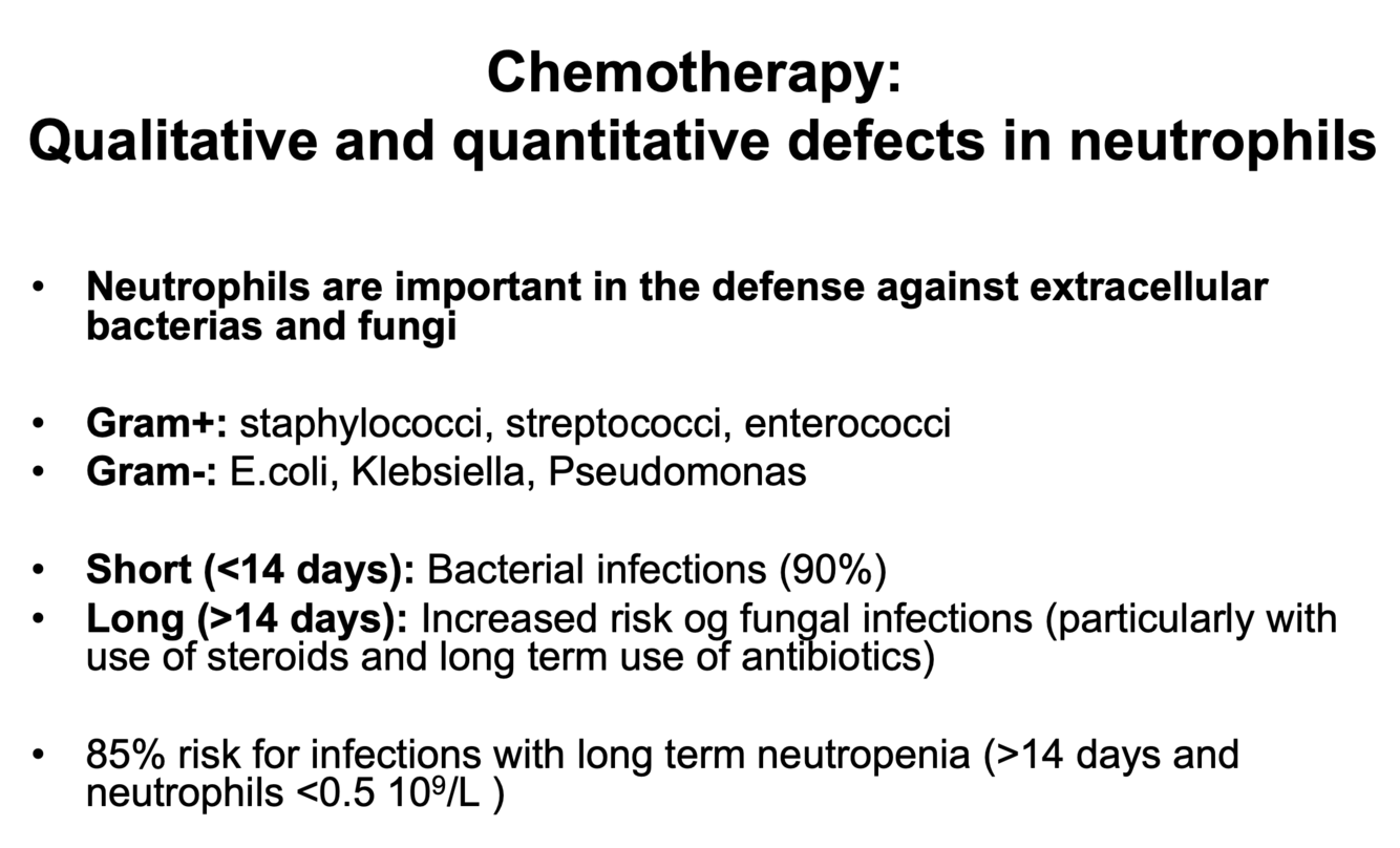 Hvilke organismer beskytter nøytrofile granulocytter oss mot, og hvordan kan kjemoterapi føre til økt risiko for infeksjoner?