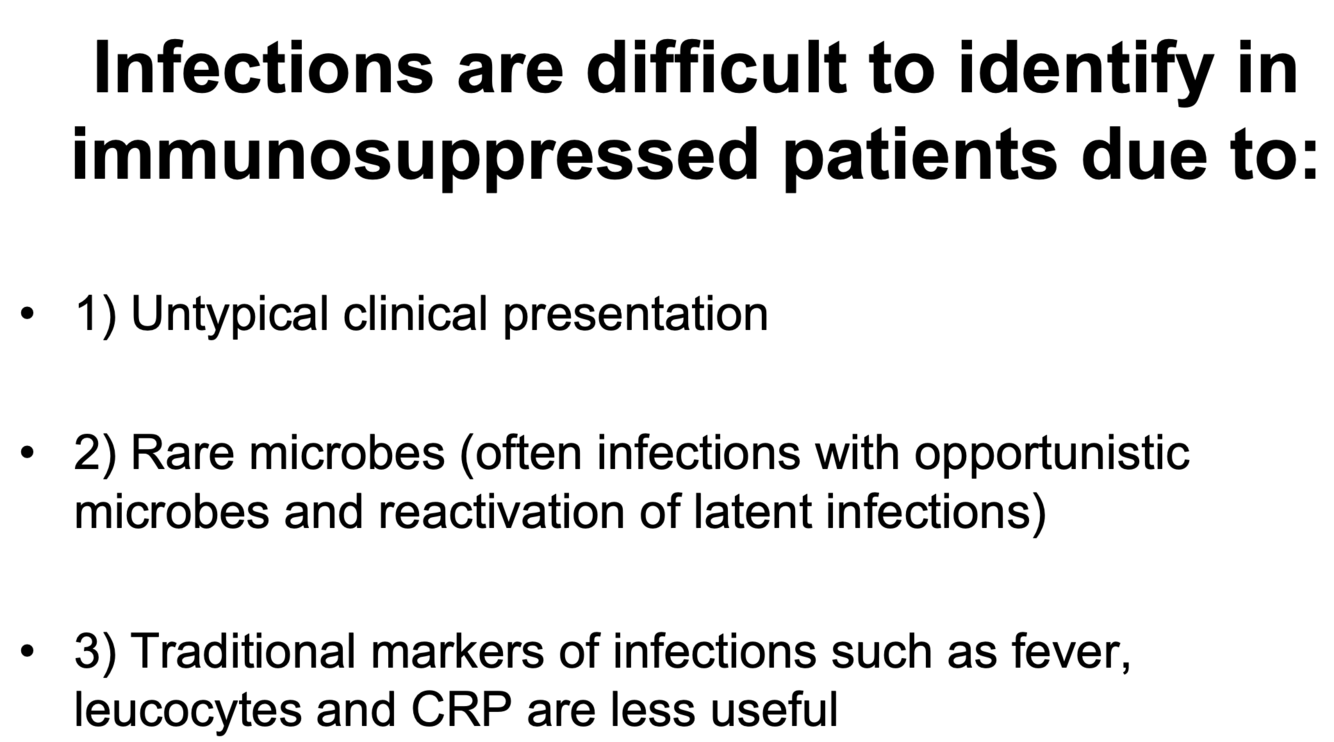 Hvilke tre årsaker gjør at det er vanskelig å identifisere infeksjoner hos immunsupprimerte pas.?