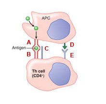 This image shows an antigen-presenting cell activating a CD4 Th cell. Identify (A-E), which all activate the Th cell.