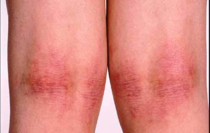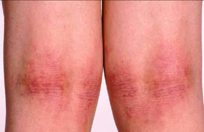 These rashes frequently present as erythematous plaques and papules around the flexor surfaces of the elbows and knees. Excoriations, scaling, and vesicles can sometimes be seen.