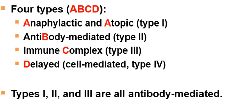 What are the GENERAL descriptions of the 4 types of hypersensitivity responses?