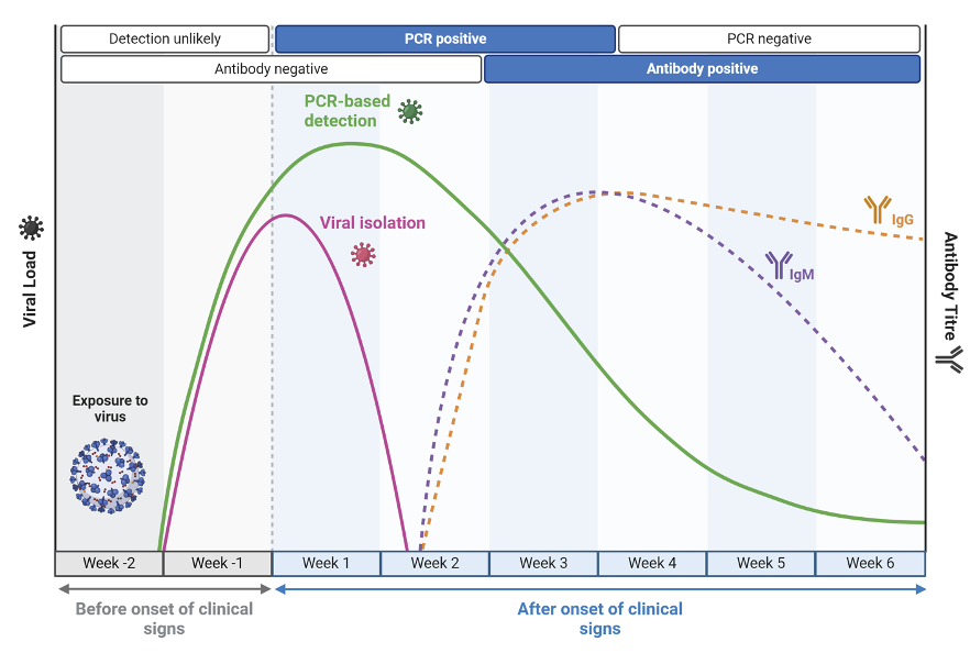 Infectious virus detection lasts only few days, but PCR-based detection lasts longer due to high sensitivity