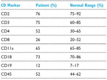 A 4-year-old child is referred with the diagnosis of type 1 LAD. She has a history of recurrent bacterial infections, including pneumonias and skin abscesses. Radiography demonstrates granuloma-like lesions in her lungs and liver. However, the data in the following table suggest this condition has not been properly diagnosed. Which of the elements in the table is inconsistent with a diagnosis of type 1 LAD?