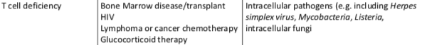 What are the possible causes and high risk pathogens for T cell deficiency?