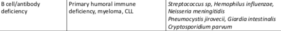 What are the possible causes and high risk pathogens for B cell / antibody deficiency?