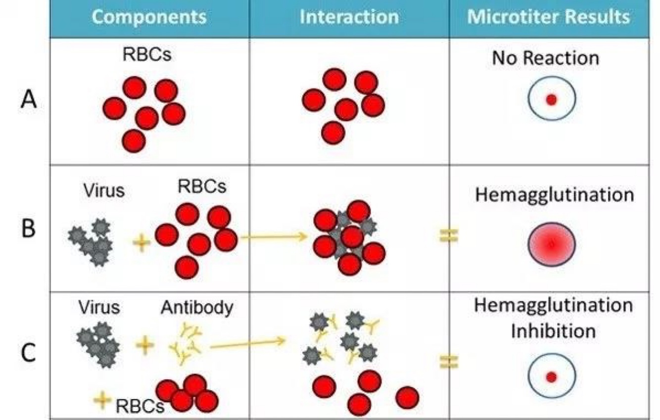 -if antibodies against virus are present = inhibit hemagglutination of RBCs