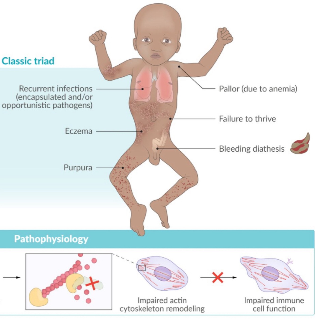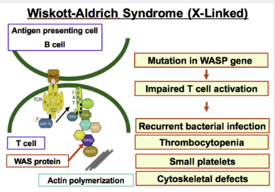 Mutations result in impaired signaling to actin cytoskeleton reorganization and therefore impaired T-cell function and thrombocytopenia.