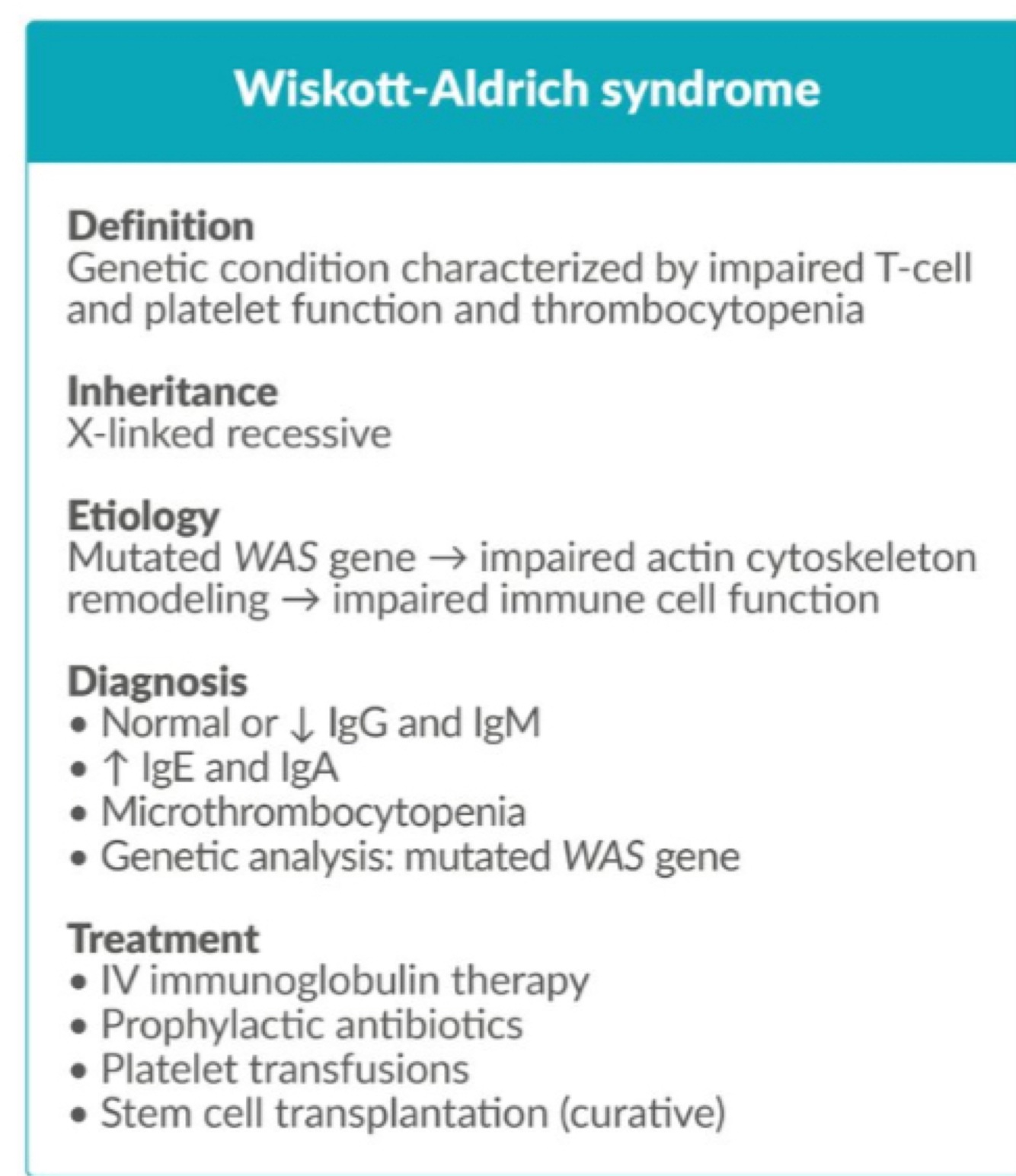 Caused by a mutation in the WAS gene, which results in impaired signaling to actin cytoskeleton reorganization and therefore impaired T-cell function and thrombocytopenia