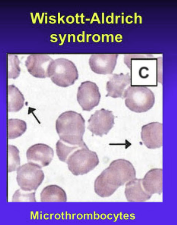 Leads to low T Cell counts, normal B cell counts, and low platlets.