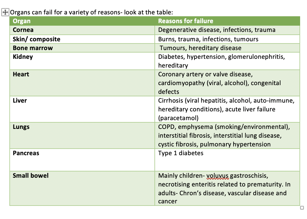 Give some examples of organs and their reasons for failure