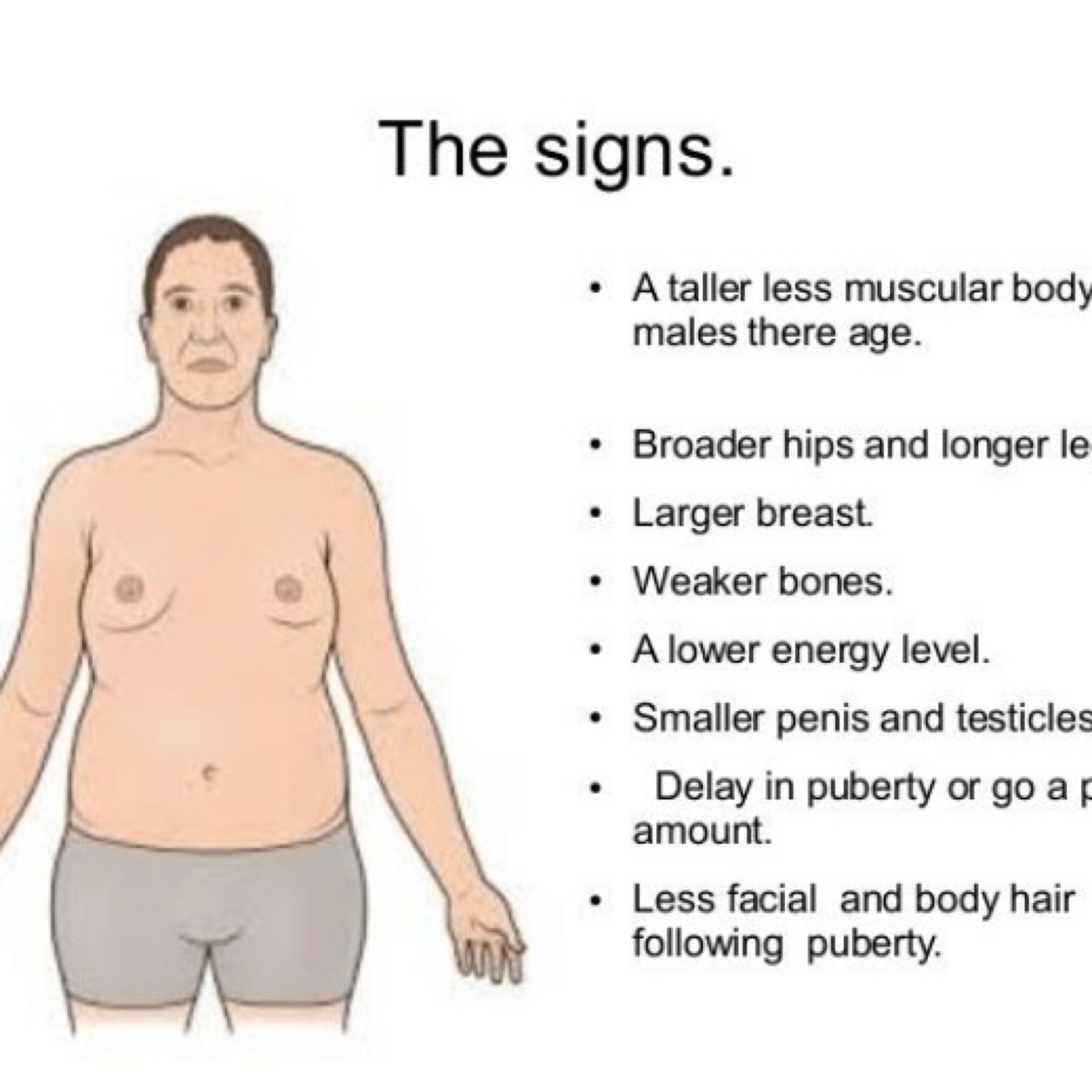 •Phenotypes: Small firm testes, small penis, sparse pubic, armpit, and facial hair.