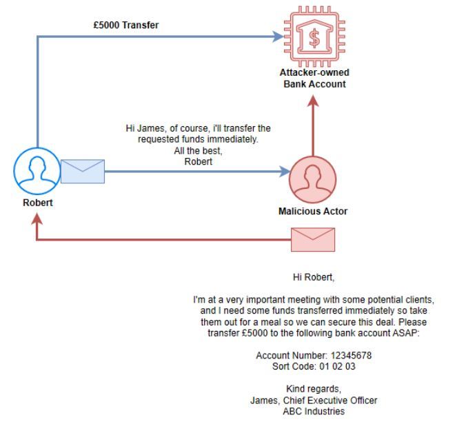 The below diagram shows an example phishing attack where a malicious actor is posing as the CEO to convince an employee in the Finance Department to send funds to an attacker-owned bank account.